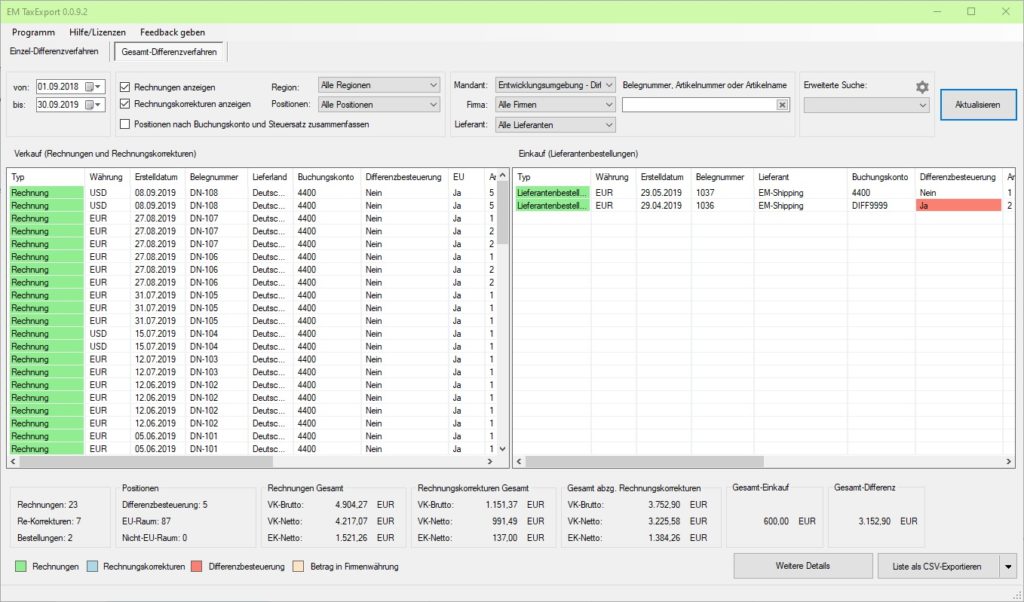 - CSV Export aller übrigen Rechnungsdaten, ausgeschlossen der differenzbesteuerten Artikel